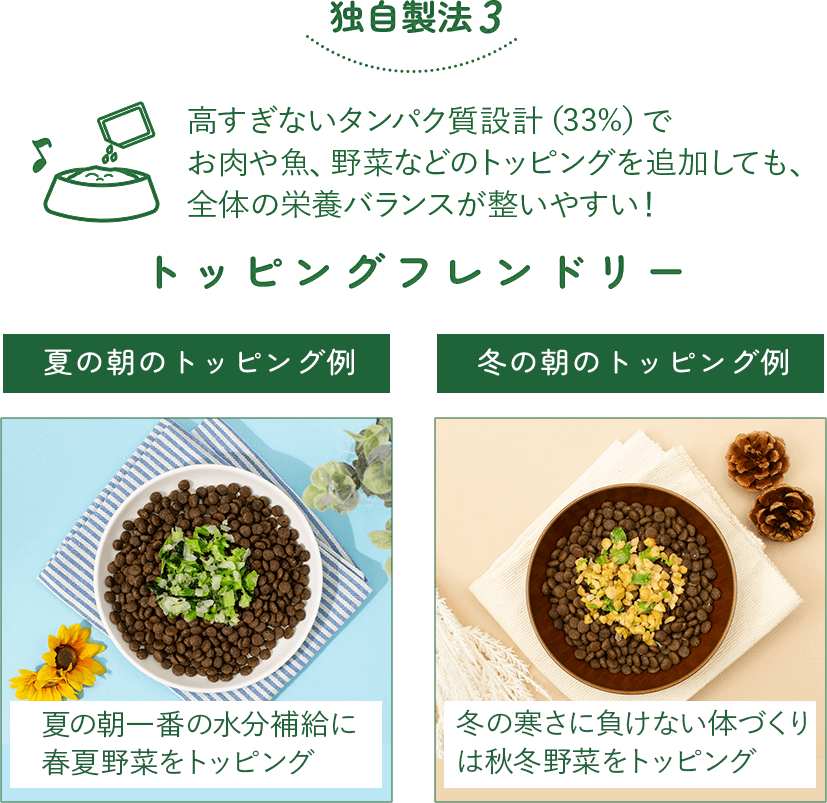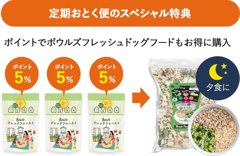 朝は低GI設計のボウルズブレックファーストで糖の吸収をゆるやかにコントロールし、愛犬の1日の健康を支える。