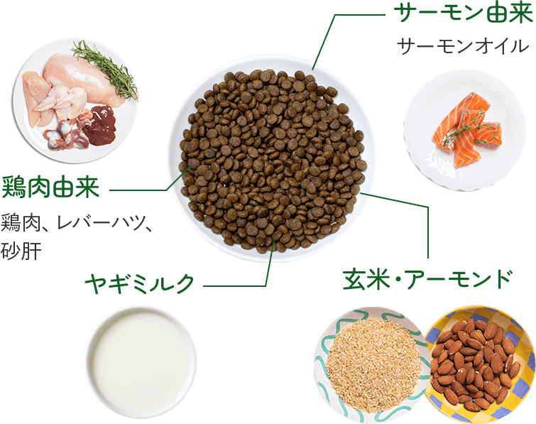 鶏生肉(新鮮)、乾燥鶏肉、玄米、エンドウ豆プロテイン、鶏レバー(新鮮)、鶏砂肝(新鮮)、鶏ハツ(新鮮)、チキン加水分解物(液体)、チキン加水分解物(粉末)、サーモンオイル、ボラージオイル(ルリジサ種子油)、月見草油、チキンオイル、キヌア、クランベリー、ブルーベリー、チアシード、亜麻仁、ほうれん草、ヤギミルク、アーモンド、ミネラル類(鉄、亜鉛、銅、マンガン、ヨウ素、セレン)、ビタミン類(A、D3、E、B3、B1、B6、パントテン酸、B2、K3、葉酸、ビオチン、B12)、塩化カリウム、ホスファチジルコリン、乾燥海藻、ビタミンE、ビタミンC、ローズマリーエキス、バチルス・サブチルス(プロバイオティクス)、ユッカエキス