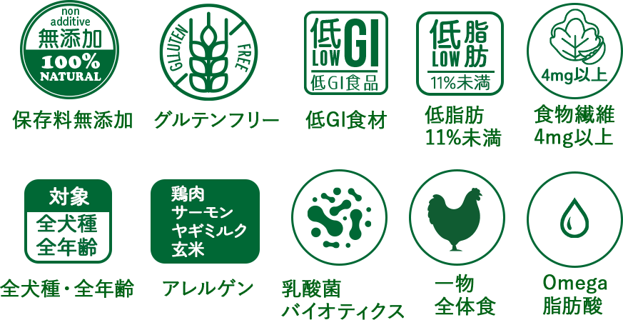 全犬種・全年齢対応・低GI(GI値55以下)・総合栄養食・保存料不使用・小麦グルテンフリー